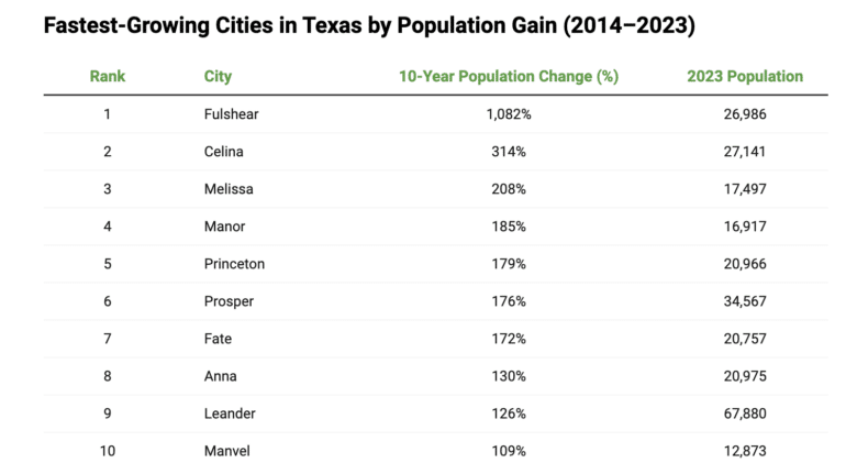 Texas dominates the podium when it comes to population growth, with Fulshear claiming the top spot nationwide. This Houston suburb saw its population skyrocket by an astonishing 1,000% between 2014 and 2023 — cementing its status as the fastest-growing city in the country during that period.