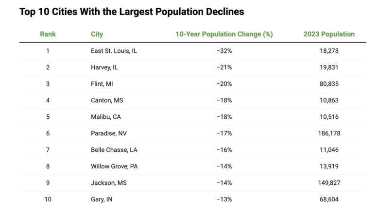 East St. Louis, IL, ranks first nationwide for population decline, with a 32% drop between 2014 and 2023. Harvey – located in the Chicago metro area – comes in second with 21% population drop. In neighboring Gary, the number of locals went down by 13% in the last decade. Economic stagnation is the likely factor behind this trend. Meanwhile, Chicago proper held steady over the same period, and St. Louis, MO, saw its population shrink by around 7%. Similarly, economic difficulties might also be behind the 20% population drop in Flint, MI, as well.