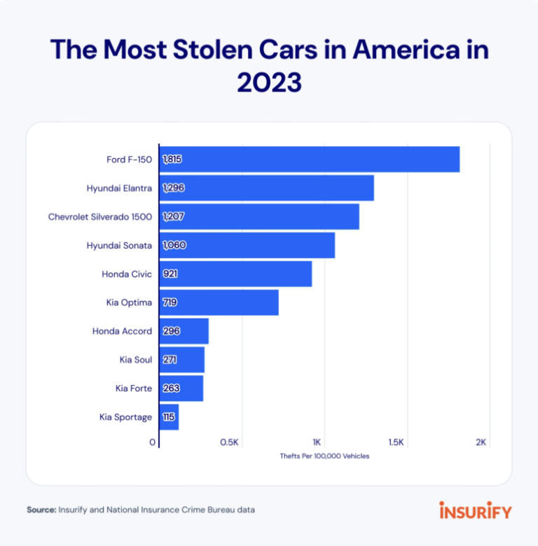 The data scientists at Insurify referred to the NICB’s 2023 Most Stolen Vehicles report to determine the 10 most stolen vehicles in the nation. This report includes data on the number of thefts.