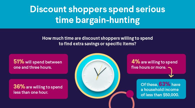 The new wave of smart shoppers are dedicated bargain-hunters. They will invest hours to get a great deal. In fact, more than half (51%) will spend between one and three hours extra to find savings or specific items at discount stores. A dedicated 4% are willing to spend five hours or more. (Of these, 63% have a household income of less than $50,000.)