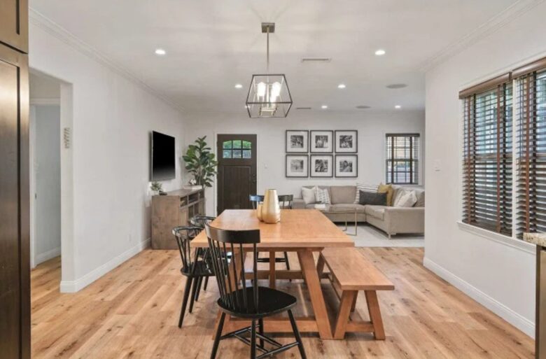 The charming single family home sits on a sought-after, tree-lined street in Sherman Oaks, Los Angeles. Built in 1941, the house has 1,505 square feet of living space, three bedrooms, two baths and a bright living room with an open floor plan.