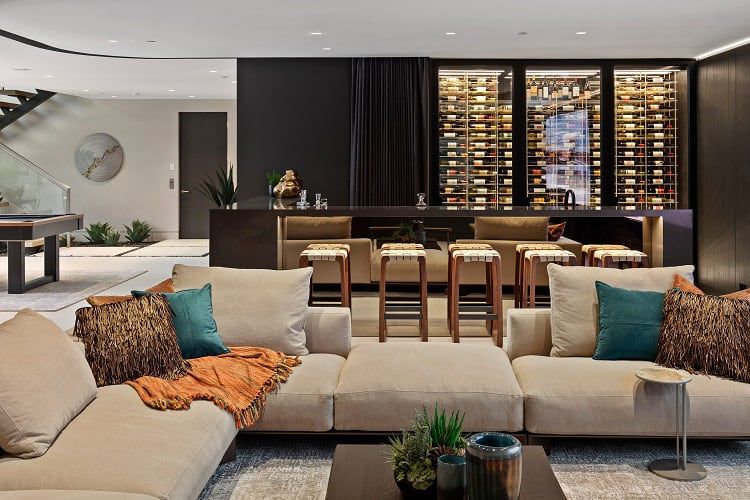 Featuring a cascading waterfall, the lounge, media room, and lower-level suite offer a multisensory experience filled with natural light and enhanced by the sound of flowing water.