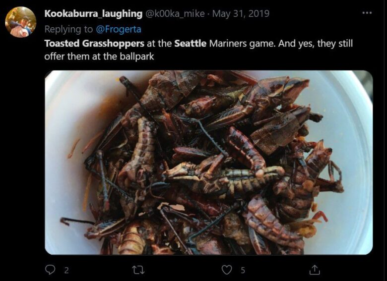 I believe the traditional song goes, “Buy me some peanuts and Cracker Jack,” not, “Buy me some peanuts and grasshoppers.” But if you’re at T-Mobile Park in Seattle, Washington, you might be tempted to start singing about these jumping insects.