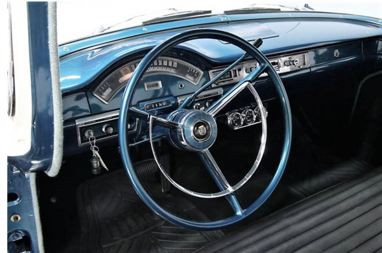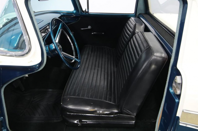 “The black interior has a clean and tasteful look. In fact, the split bench has a hint of tuck-and-roll pattern. And all the darkness of the upholstery really makes the bright dash pop. There are nice classic elements, like the artful steering wheel and bright classic gauge panel.