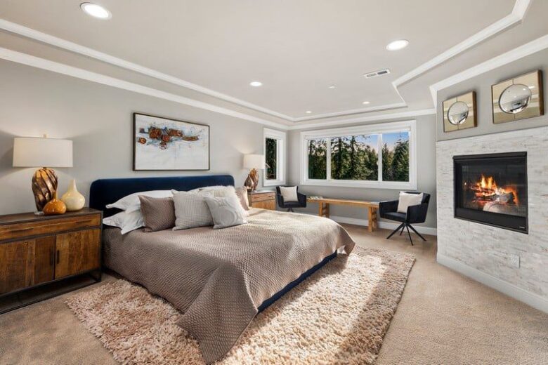 A spa-like primary suite with cozy fireplace and walk-in closet