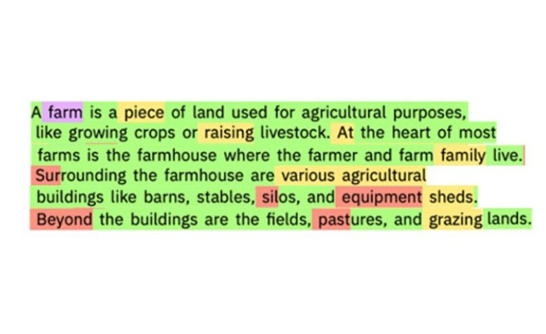I asked Claude to describe a farm, and then fed its results into GLTR. Every green word that you see below is the word, or root of a word, that’s most likely to appear in that specific spot. (Purple, yellow, and red represent lower probabilities.)