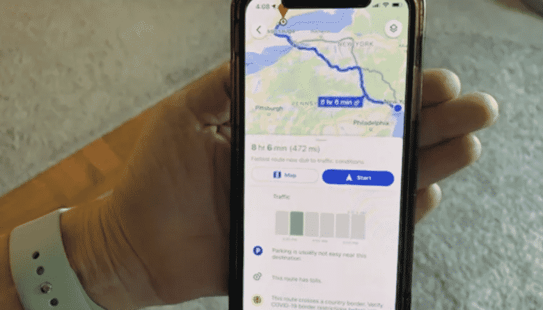Warnings also appear if you’re pulling up directions to another country, such as Canada, by car, foot or bicycle. Here the warning tells you that the route involves crossing a border, and that you should verify Covid-19 travel rules before you leave.