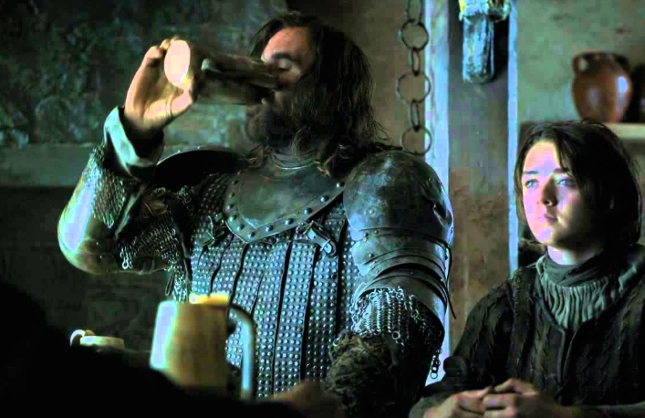 While Sandor Clegane and Arya Stark are traveling, they encounter a farmer and his daughter, who give them a place to stay and food to eat. They are served a rabbit stew, which Clegane devours ravenously and with appalling table manners. Have you heard of a spoon?