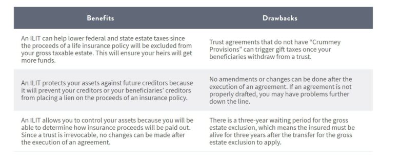 An Irrevocable Life Insurance Trust comes with a variety of advantages and drawbacks. For example, an ILIT is a great option if you want to set aside your assets for specific purposes, but you may be responsible for paying gift taxes if a beneficiary withdraws from a trust. Make sure to weigh all pros and cons before deciding to create one.