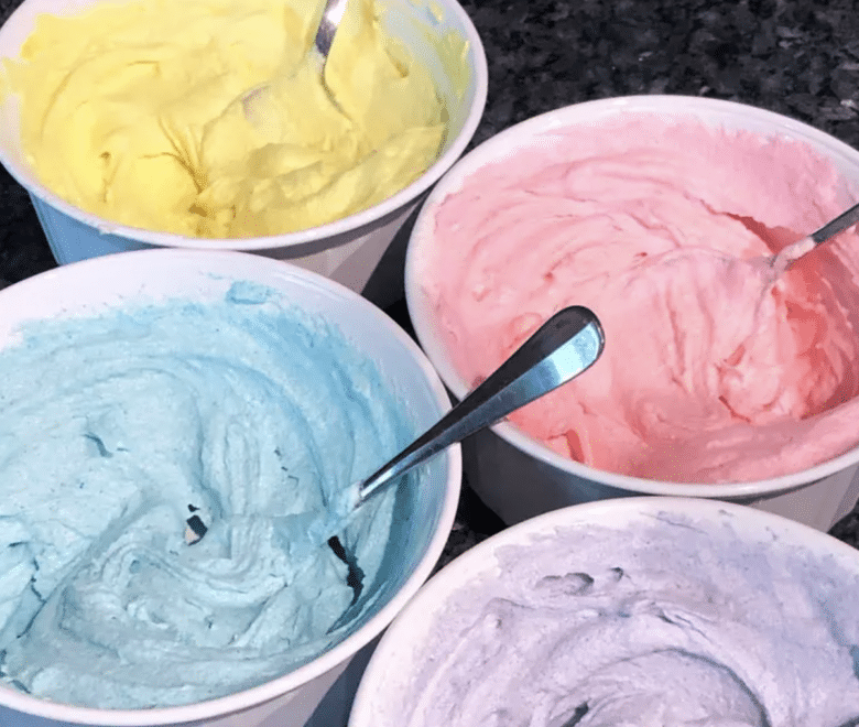 • Food Coloring: I used wilton gel colors the first time I made this recipe. The second time, I used color garden natural food coloring. I used light pink, purple, light yellow, and sky blue.
