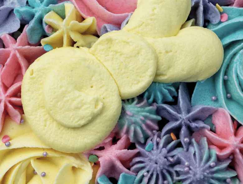 When I first published this cake recipe in 2020, there were 2 popular cake trends. One was a sheet cake trend. The other was piping buttercream designs onto parchment paper and then waiting until they harden before placing them on the cake. I got the idea for piping bunnies that look like marshmallow peeps from Steph Q of Qookie The Cakery. Her cakes are so cute!