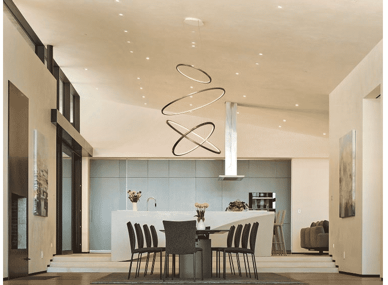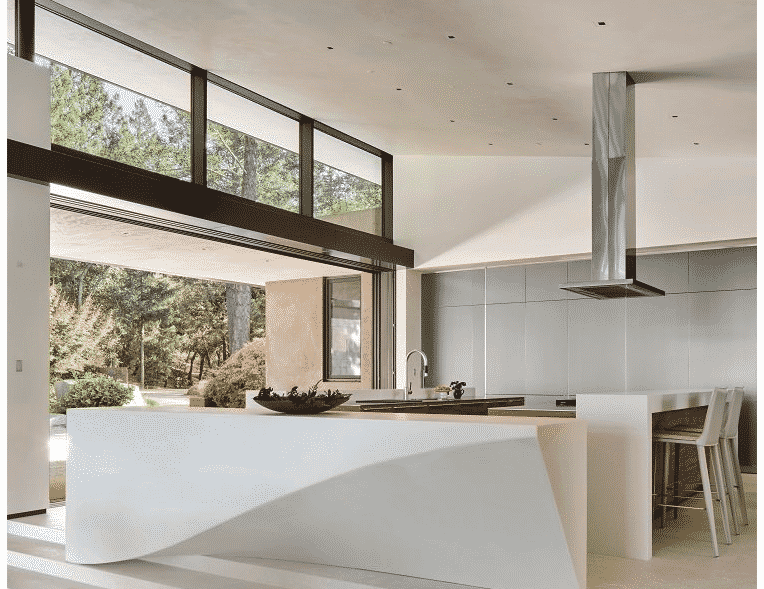 Featuring a custom window and door system, the home also offers motorized Mecho shades, stucco, steel and hand-hewed Bianco Avorio limestone from the Veneto region of Italy.