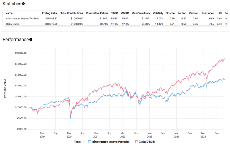 When you look at the backtests, the strengths and weaknesses of this infrastructure income portfolio become clear. Relative to a simple global 75/25 stock-bond portfolio, the infrastructure mix has delivered lower long-term returns, with a cumulative return of about 52% versus nearly 89% for the traditional allocation over the same period. The annualized return gap is meaningful, roughly 5.9% versus 9.1%.