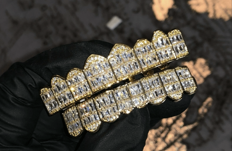 A removable or permanent dental overlay, typically made of silver, gold or another metal and often inset with gemstones, which is worn as jewelry.