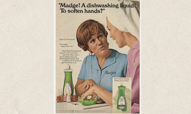 A dishwashing liquid poster showing a woman dipping her fingers in the liquid, 1970.
