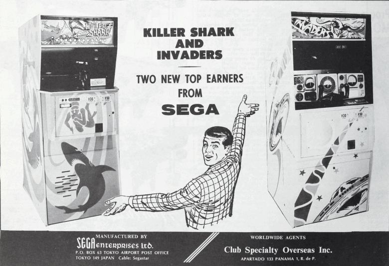 1972 advertisement from Cash Box by Sega for their electro-mechanical games Killer Shark and Invaders.
