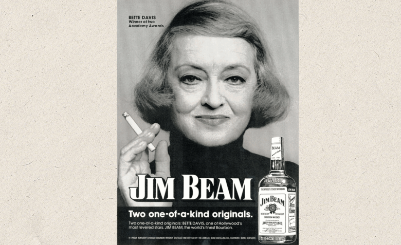 An advertising of Jim Beam with this text on the poster “Two one-of-a-kind originals: Bette Davis, one of Hollywood’s most revered stars. Jim Beam, the world’s finest Bourbon”. 1973.