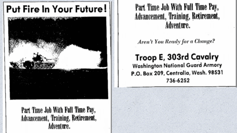 A recruiting advertisement for Troop E, 303rd Cavalry, Washington Army National Guard in the local Centralia Daily Chronicle newspaper, 1977.
