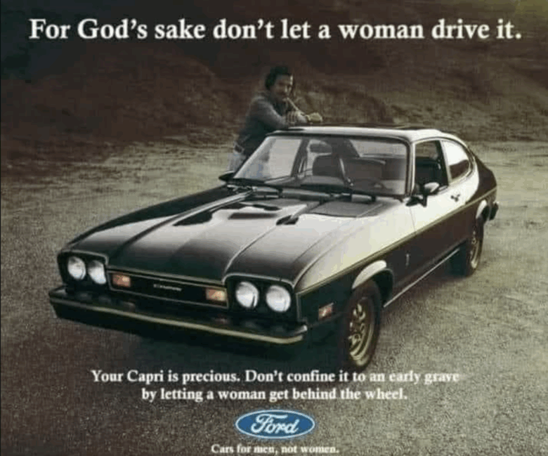 Ford advertising with the text “Don’t let a woman drive it” as some kind of humor.