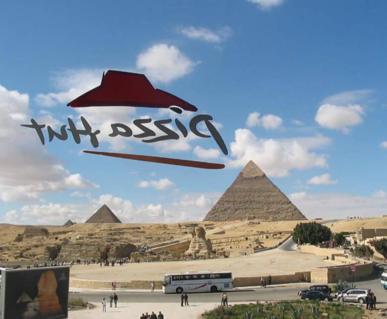 That inverted logo you see is actually the Pizza Hut marking on the other side of the glass window! That’s because at this Giza Pizza Hut, you can eat your pizza with the phenomenal view of the pyramids!