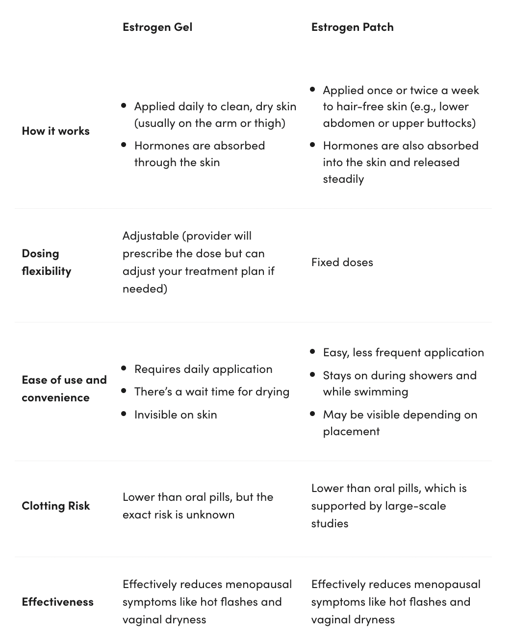 Here’s a side-by-side comparison of estrogen gel and estrogen patches: