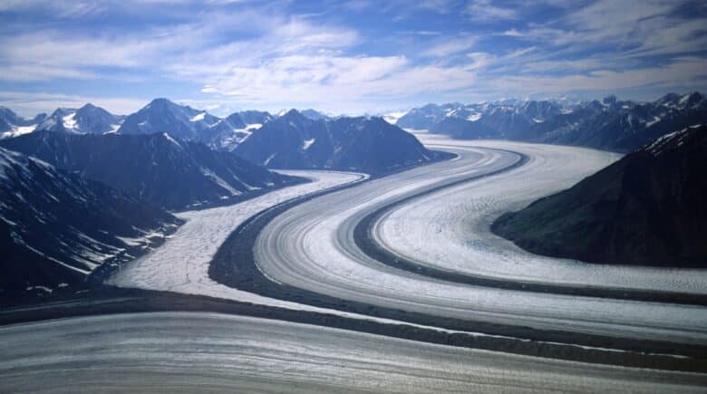 Kaskawulsh, a glacier in Yukon Territory’s St. Elias Mountains, has retreated so rapidly that a few years ago it caused a river it once fed to disappear.