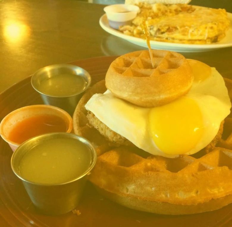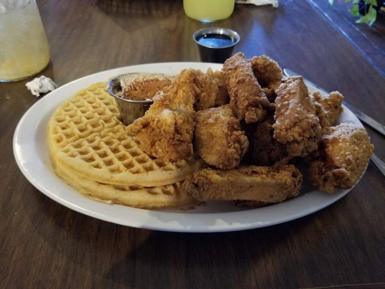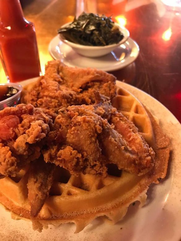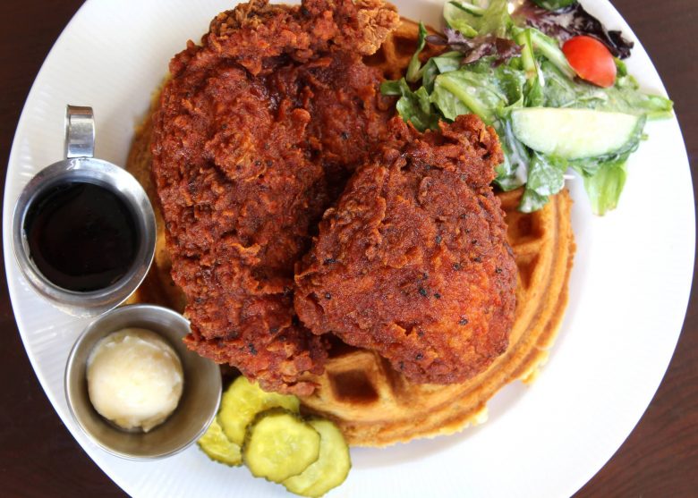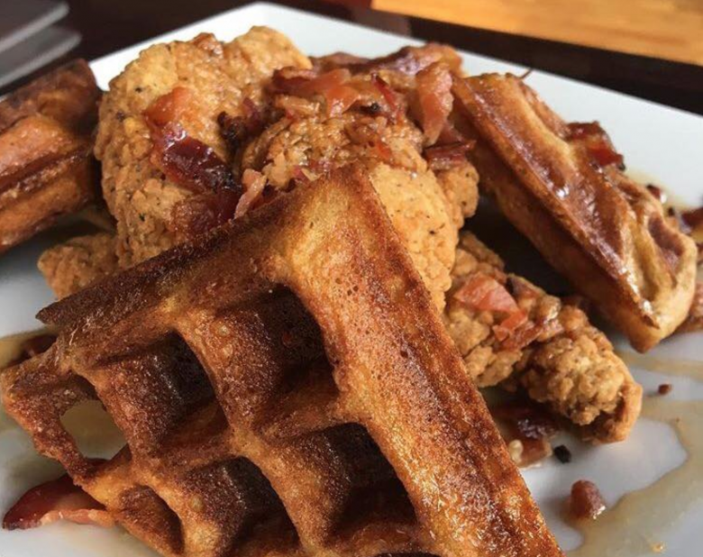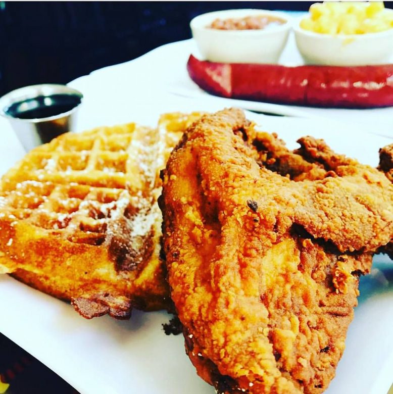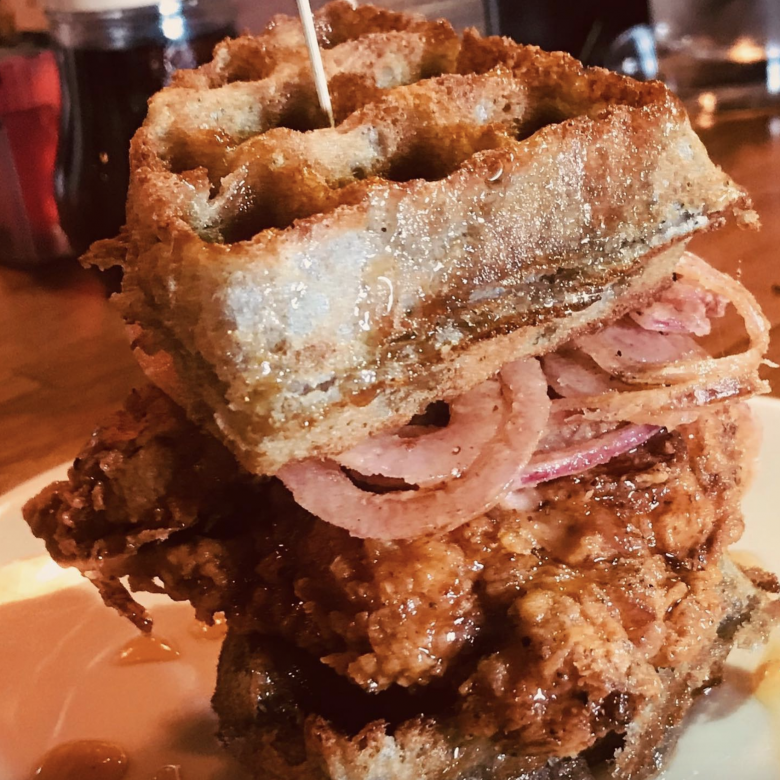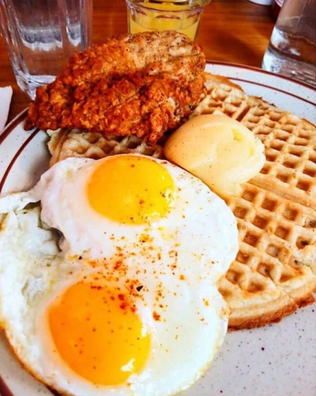 This is a restaurant known for its hipster feel, craft coffees and cocktails. What people may not know is they have well-respected chicken and waffles with names like “Southern Comfort,” a blue cornmeal waffle, buttermilk fried chicken, two eggs and topped with bourbon maple syrup. Need something a little more extra? Try the “Chicken & Waffle Stacker” consisting of buttermilk fried chicken, bacon and pepper jack cheese on a blue cornbread waffle with a side of bourbon maple syrup.
