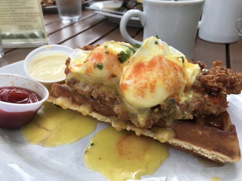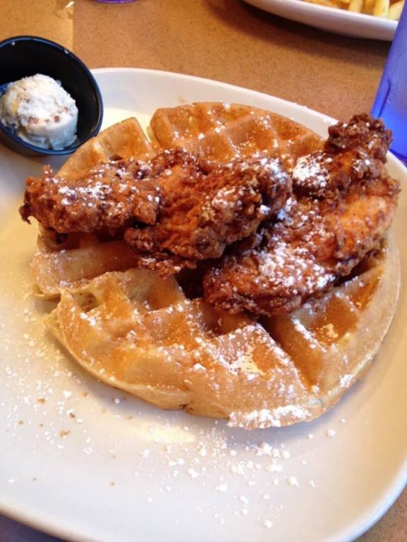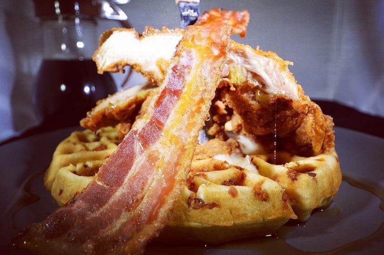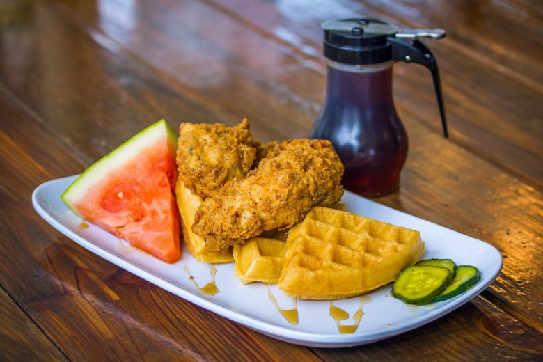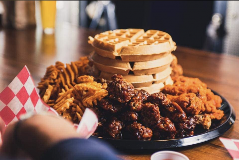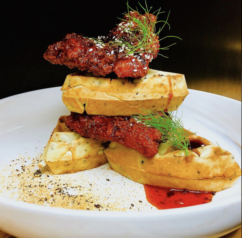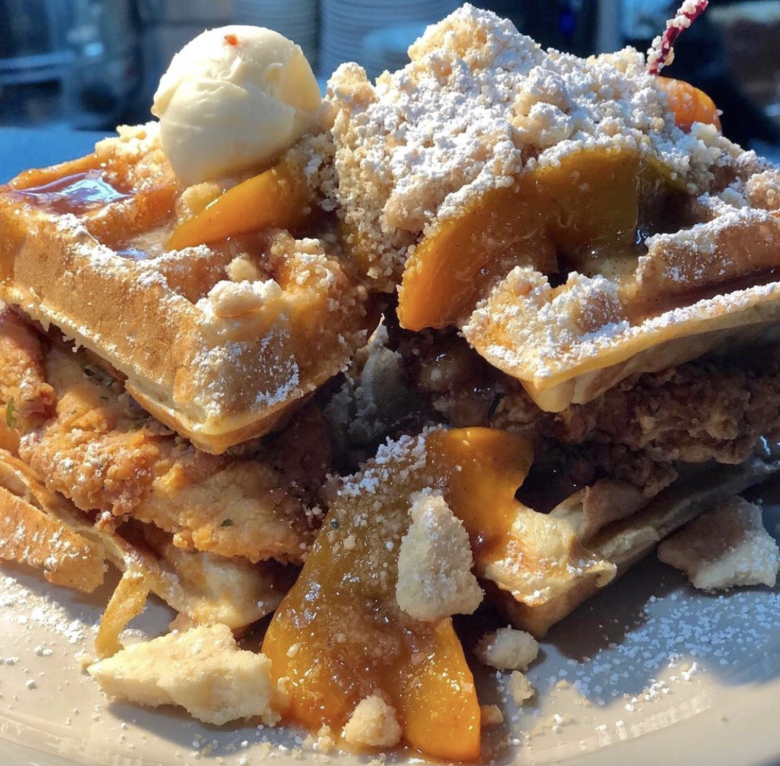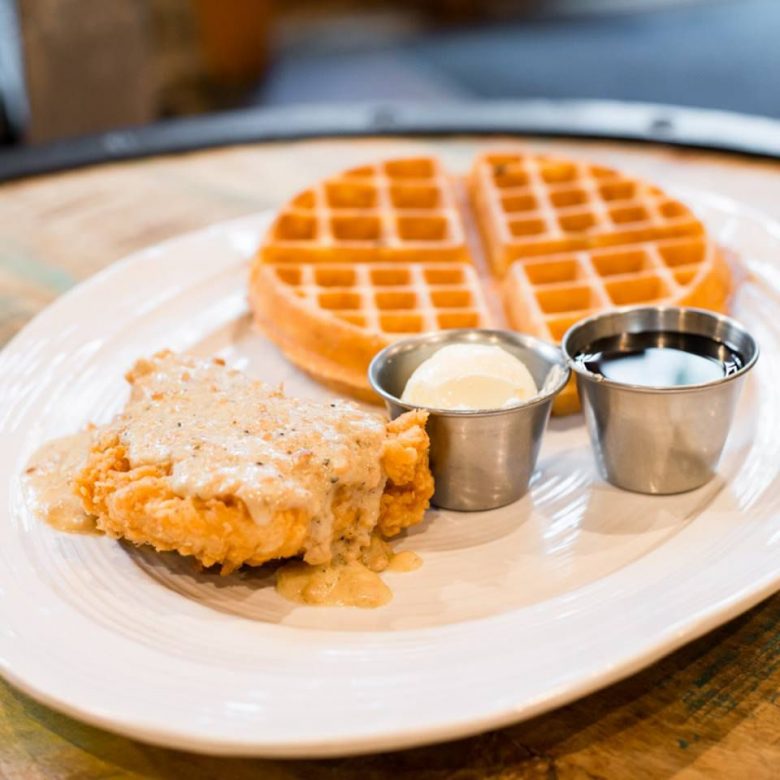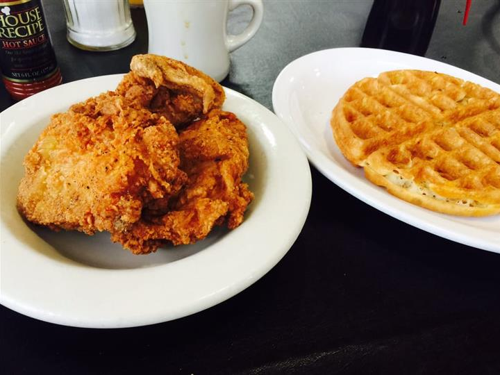 This is a restaurant known for its hipster feel, craft coffees and cocktails. What people may not know is they have well-respected chicken and waffles with names like “Southern Comfort,” a blue cornmeal waffle, buttermilk fried chicken, two eggs and topped with bourbon maple syrup. Need something a little more extra? Try the “Chicken & Waffle Stacker” consisting of buttermilk fried chicken, bacon and pepper jack cheese on a blue cornbread waffle with a side of bourbon maple syrup.