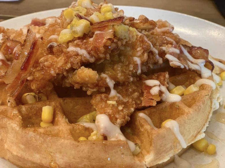 This self-proclaimed environmentally-friendly establishment aims to locally source their food whenever possible. They also serve cocktails if you’re feeling the need for a Bloody Mary or mimosa with your chicken waffles. The chicken is made with a Rice Krispies coated chicken breast and it all comes served with bacon & fire roasted poblano corn, hot honey drizzle, zesty maple sour cream and scallions.