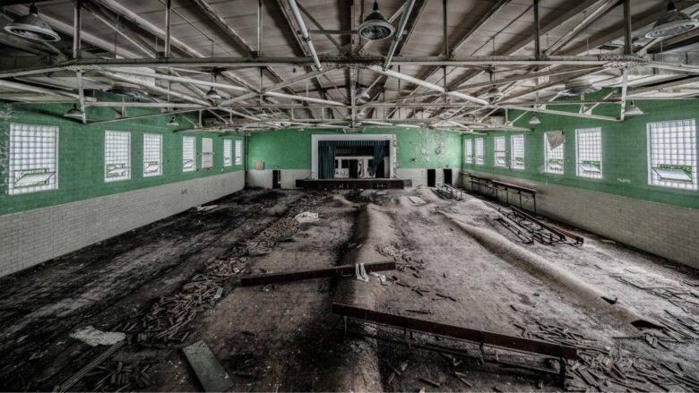Located in the Finger Lakes Region of New York are the remnants of the Glen Springs Resort. Originally opened as a health resort in 1872 to take advantage of the local mineral springs. The only remaining intact building is this old gymnasium with its floor wrinkled and damaged from water damage over the years.