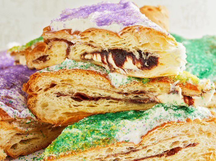 King Cakes are synonymous with Mardi Gras and New Orleans. King Cakes are a hand braided sweet brioche bread filled with cinnamon sugar and frosted in purple, green, and yellow icing. A small, plastic baby is placed inside the cake.