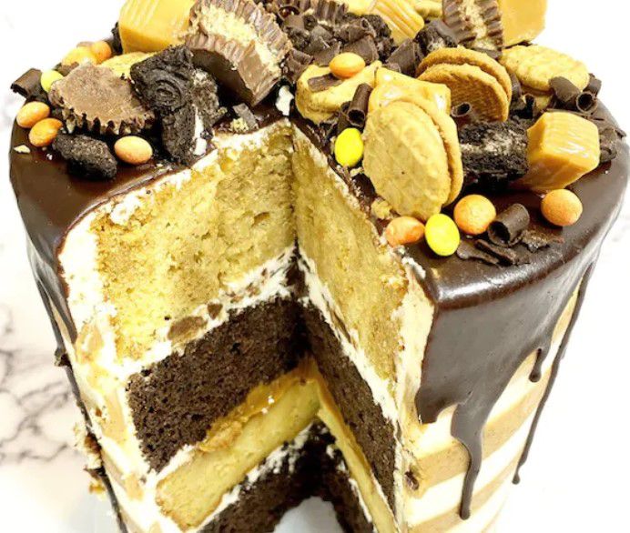 The Spank Me Cake boasts layers of chocolate cake with buttercream and chocolate chips and Reese’s cake with Reese’s buttercream sandwiched together with dulce de leche. The cake is capped off with Nutter Butter cookies, Reese’s pieces, Reese’s mini peanut butter cups, and chocolate curls.