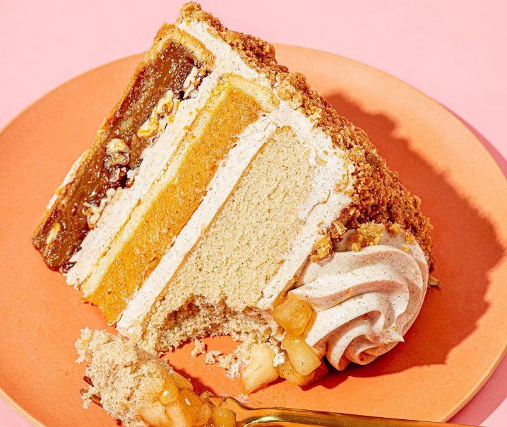The Original PieCaken features holiday-inspired desserts: pecan pie, pumpkin pie, and spice pie topped with cinnamon buttercream frosting and apple pie filling.