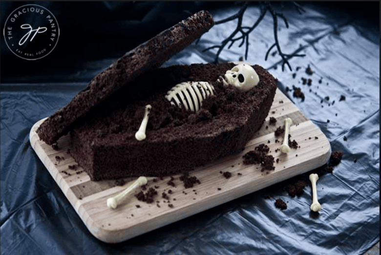 Delicious, chocolate bread in the shape of a coffin. Perfect for Halloween guests and dessert tables.