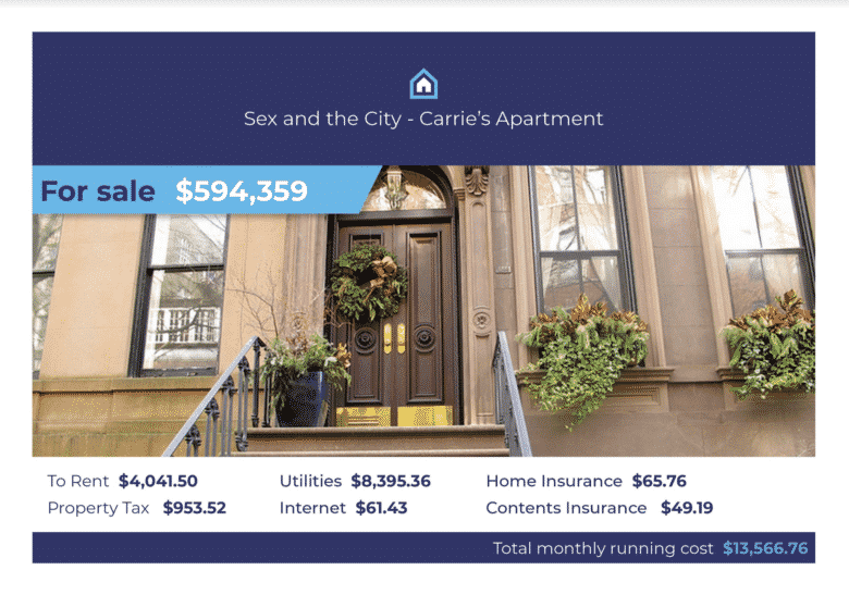 Compared to the other homes on our list, Carrie’s apartment is, surprisingly, on the more affordable side at $594,359. That said, whilst it might be a fantastic real estate choice in the heart of New York if you could afford it, I’m not sure I could stand to part with over $13,000 a month ($13,566.76) for rent and living costs!