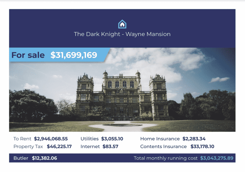 Even the rental costs would rise to a whopping $3,043,275. But that does include Alfred’s monthly $12,000+ salary, so totally worth it.
