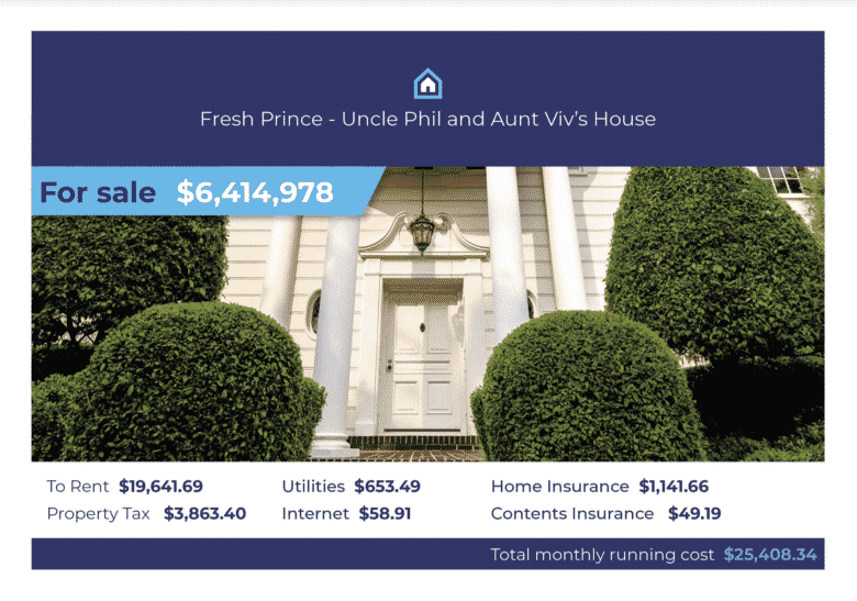 Without Uncle Phil & Aunt Viv’s fortune, we can only dream of owning this home valued upwards of six million dollars ($6,414,978 to be precise), or $25,408.34/month to rent.