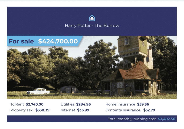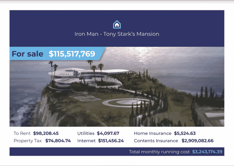 Wondering if renting the house would be more doable? Well, once you’ve added on some insurance, utilities and internet costs (thank you, Jarvis), renting it would set you back a seriously sizeable $3,243,174 per month!