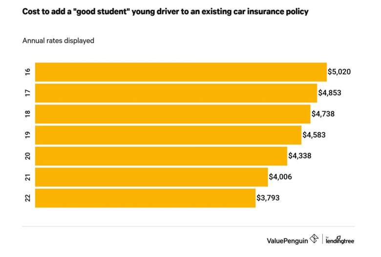 The cost to add a teen or young-adult driver who qualifies for a good student discount to an existing policy results in 6% savings a year, on average, from ages 16 to 22. Families of 16- and 17-year-old drivers whose grades are high enough to qualify for the discount can save the most, as there’s a 7% difference between the cost of insurance with and without the savings.