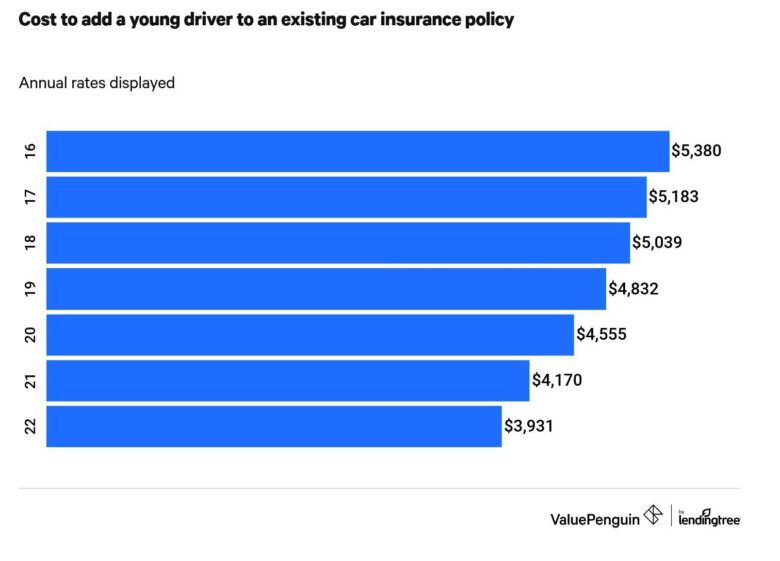 It’s highly expensive to add a teen to an existing car insurance plan. Designating a 16-year-old as a driver of an insured vehicle carries an average cost of $5,380 a year. The cost of insuring a young driver falls as the individual ages. If the young driver waits until they’re 22 years old before getting their license and being included on an insurance policy, the cost to cover them drops by 37% to $3,931 a year.