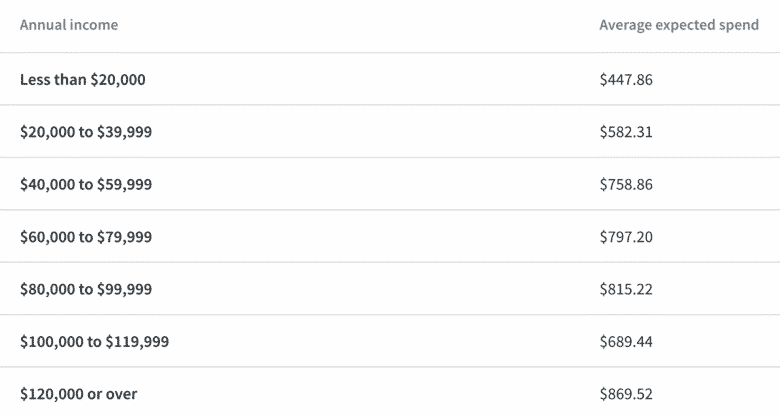 Average spending calculations are based on only the participants who were planning on spending in that particular category — for example, to calculate average pre-Christmas spending, 12.44% of participants responded “0” in all categories and were not included.
