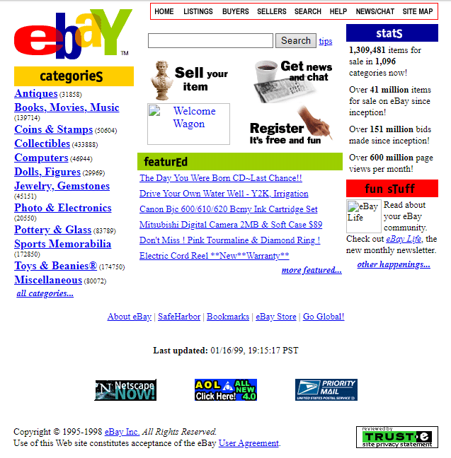 The other big commerce website of our younger days, eBay, also feels similar to its contemporary counterpart. (The company started as AuctionWeb in 1995, but rebranded as eBay in 1997 and pictured here two years later) The multicolor logo is very close to its current logo, and it makes us want to bid on weird stuff like a gorilla-shaped Cheeto. The Netscape and AOL ads feel very nostalgic, too.