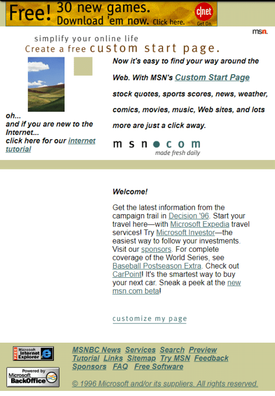 Early MSN looks pretty dull compared to the information- and photo-filled homepage of today. The “Custom Start Page” is still a helpful feature that’s going strong, though. (If you’re curious about what that “Internet tutorial” is like, it’s just as quaint as you imagine.)