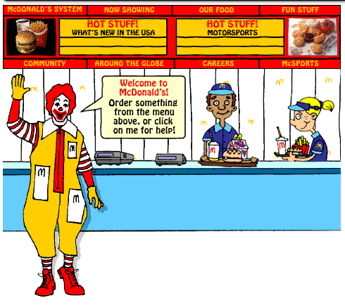 McDonald’s earliest website is adorable. It looks like you’re actually standing inside a McD’s location with Ronald greeting you and some teenagers working. The restaurant’s menu board is where the links are located, and you click on Ronald if you need help. It’s all very kid-oriented and extremely wholesome.