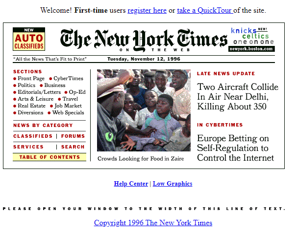 The first New York Times website was made to look similar to its print edition. Once again it’s designed for very small computer screens, though this one has a very helpful “please open your window to the width of this line of text” at the bottom in case you didn’t know how browser windows worked.