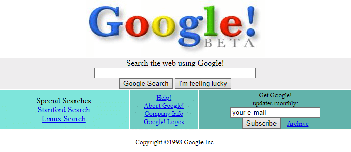 Google has always had a minimalist theme, and that rainbow-lettered logo is unmistakable, even back in 1998. Technically, this is the second Google website, but the first, published one month earlier, was just text linking to the “Google Search Engine Prototype” and the “Might-work-some-of-the-time-prototype that is much more up to date.” And you can see an earlier alpha version from 1997 here when the domain Google.com was first registered but Google the company didn’t technically exist yet.