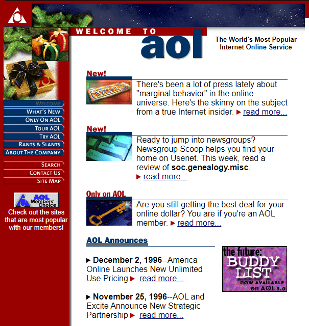 Remember AOL Instant Messenger (a.k.a. AIM)? And all those countless CDs AOL used to send you in the mail to sign up for internet service? The first iteration of aol.com from 1996 is just as nostalgic. We wonder if they ever got that “marginal behavior” online thing figured out…