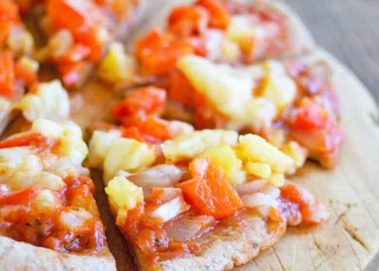 This Hawaiian pita pizza is vegetarian, but it can easily be made with your favorite healthy ham to make more authentically “Hawaiian.”