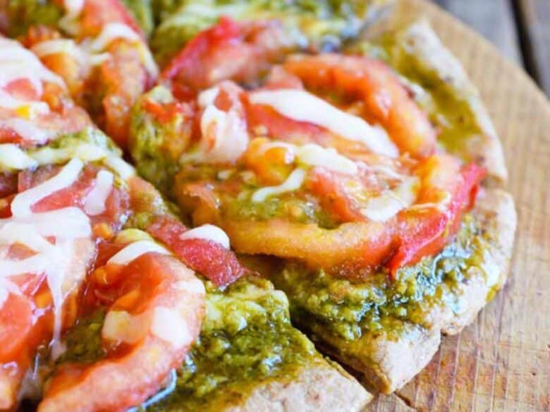 This pita pizza recipe with pesto and tomatoes is super fast, easy and delicious!