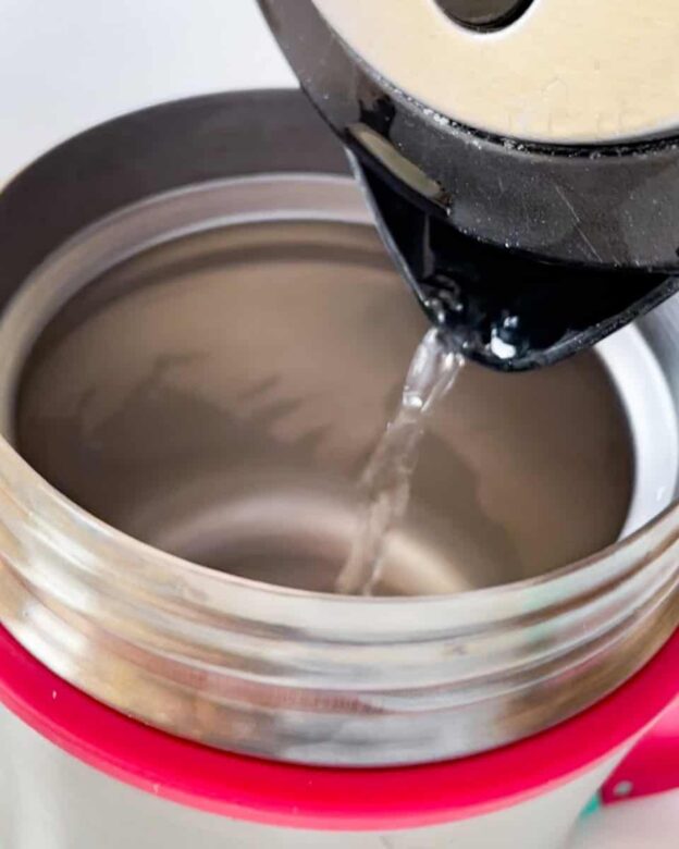 The goal here is to make sure the food is warm for lunch, not hot enough to burn anyone opening the insulated container. Make sure if you have heated anything spillable or splashable, such as soup or stew, that it is food safety hot but not scalding so it will burn any kids or adults opening the lid. If the food gets too hot then don’t preheat it for so long or use tap hot water instead of boiling hot.